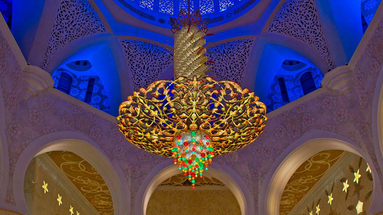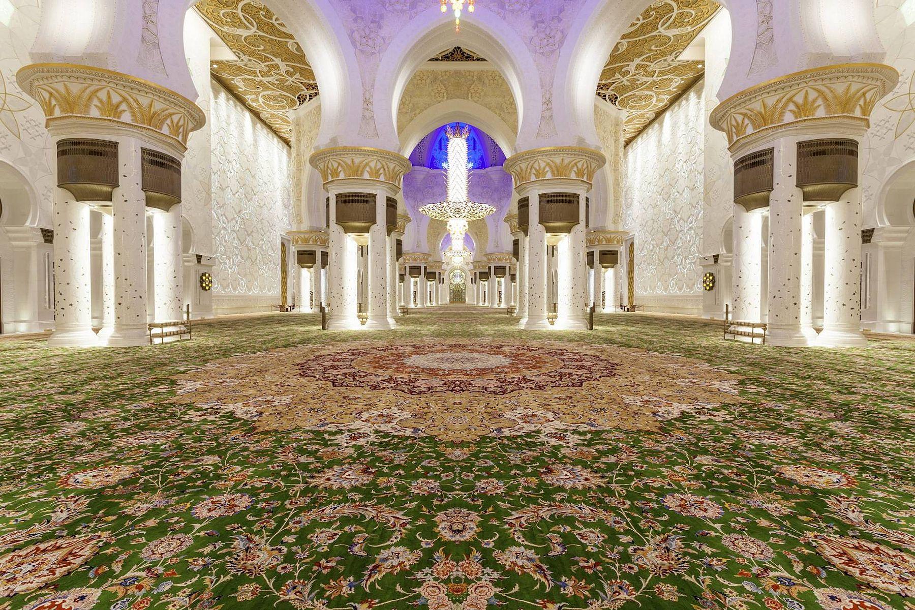 The interior of the mosque is adorned with seven giant chandeliers crafted by the German manufacturer Faustig. The largest of them reaches 15 meters in height and weighs around 12 tons. Its crystal elements and gold accents create the illusion of a cascade of precious gems.