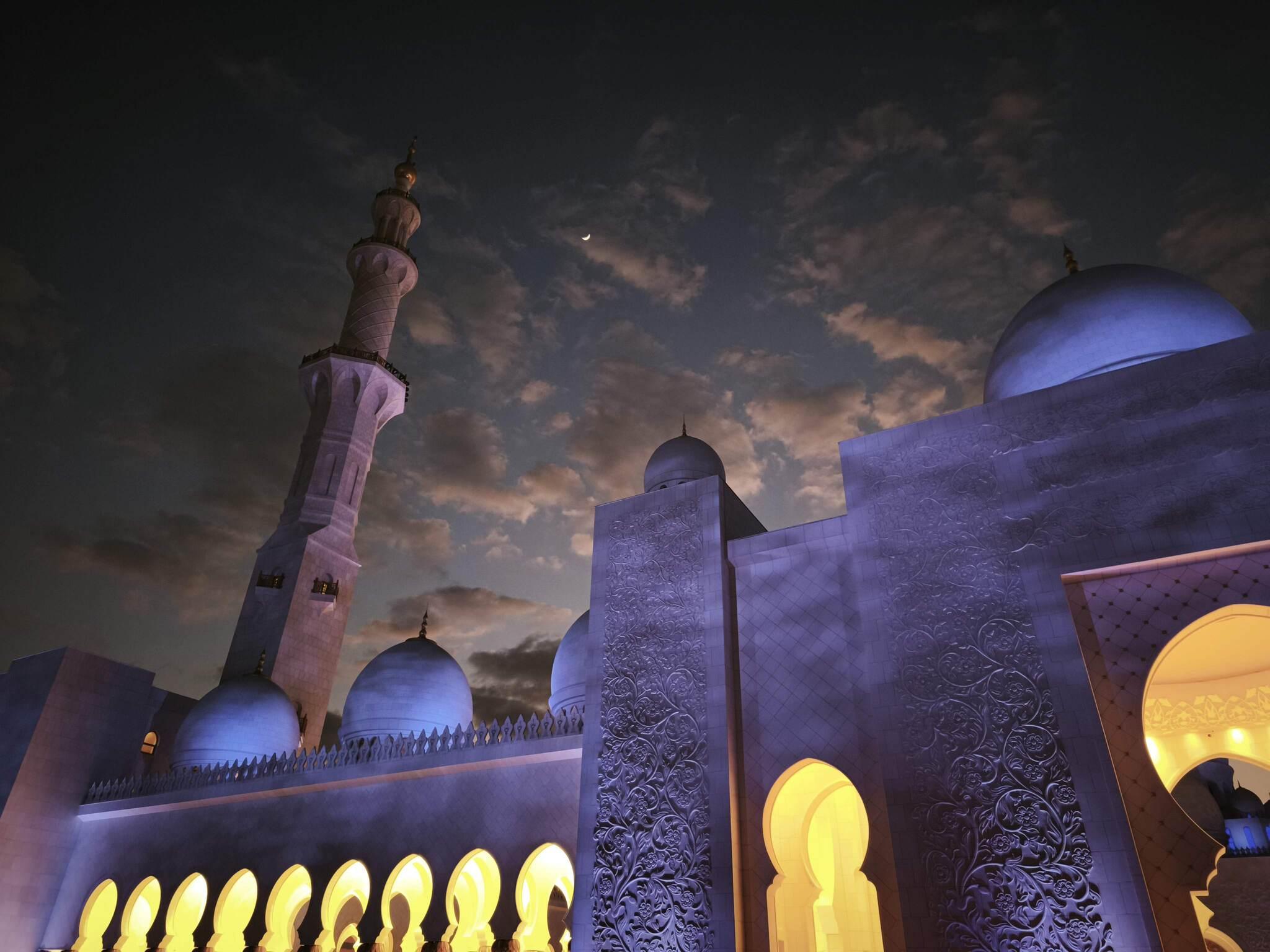 But when the moon starts to wane, the magic begins. The white glow transforms into deep, saturated shades of blue. It is as if the mosque is sinking into the depths of a nocturnal ocean.