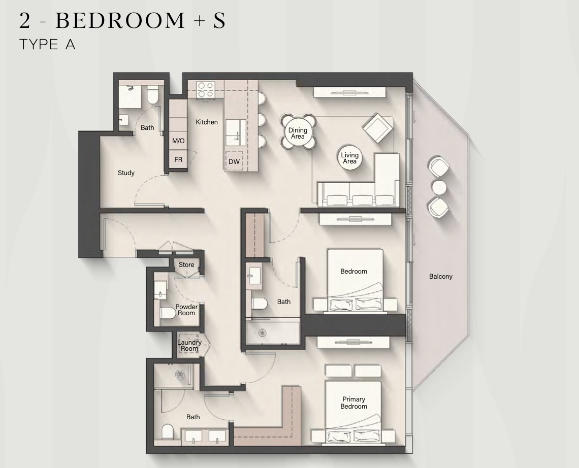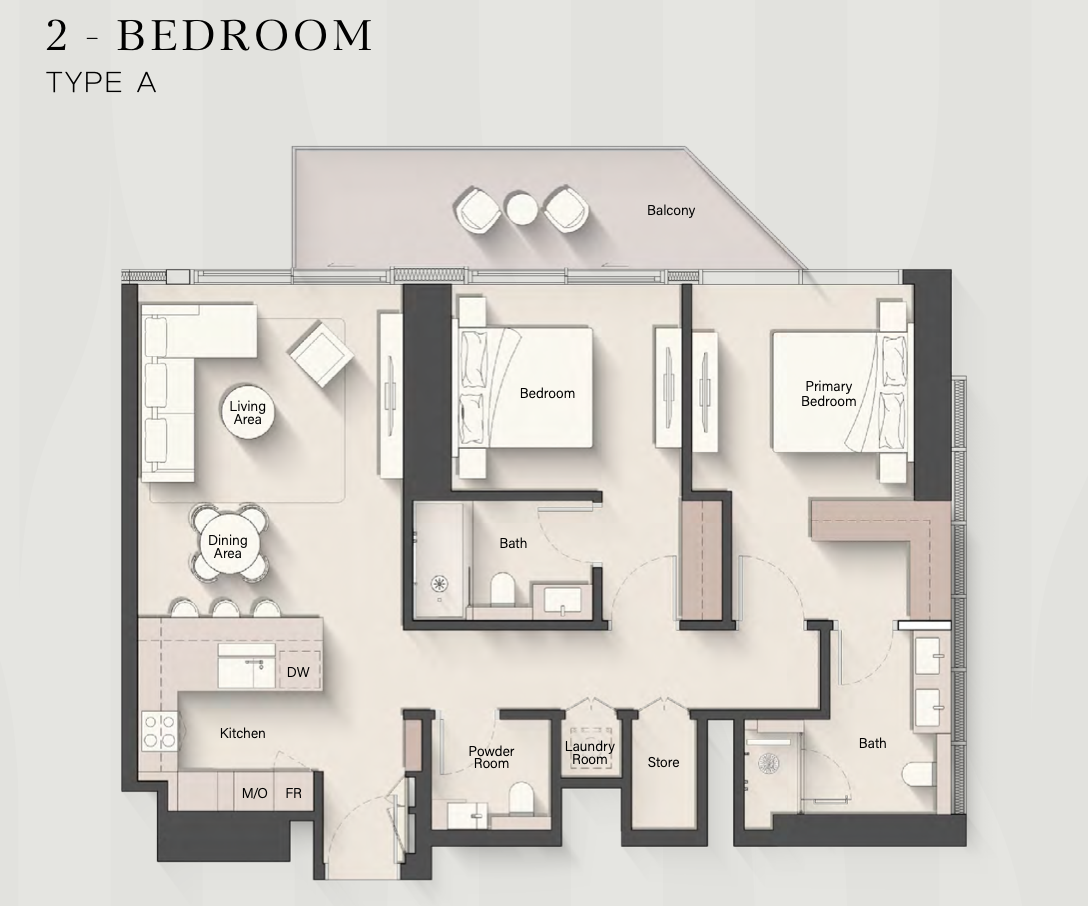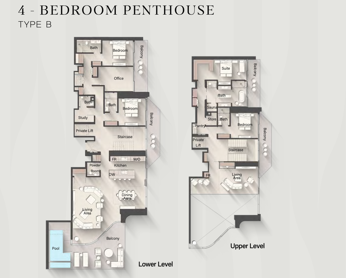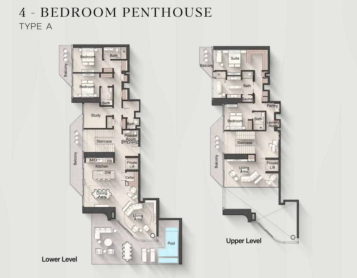 The project includes 355 properties, ranging from 1, 2, and 3 bedroom apartments to 4-bedroom penthouses. Each residence includes balconies, a kitchen with built-in appliances, walk-in closets and separate storage areas. The penthouses occupy the upper floors of the tower and additionally offer panoramic views of the waters of the Persian Gulf and the urban landscape. Residents will be able to use premium-level infrastructure: an infinity pool, Japanese thermal baths, a spa center, a fitness room with a boxing area, yoga studios, lounge bars and a club space. There are outdoor and indoor play areas for children, as well as a cinema room and a karaoke room. The project is thought out to the smallest detail in terms of comfort: a spacious lobby with a lounge, six passenger elevators, drop-off areas, landscaped spaces, 24-hour security and underground parking. The complex is located near all key infrastructure facilities, from schools and hospitals to shopping malls and restaurants. This is one of the few projects combining privacy and accessibility.